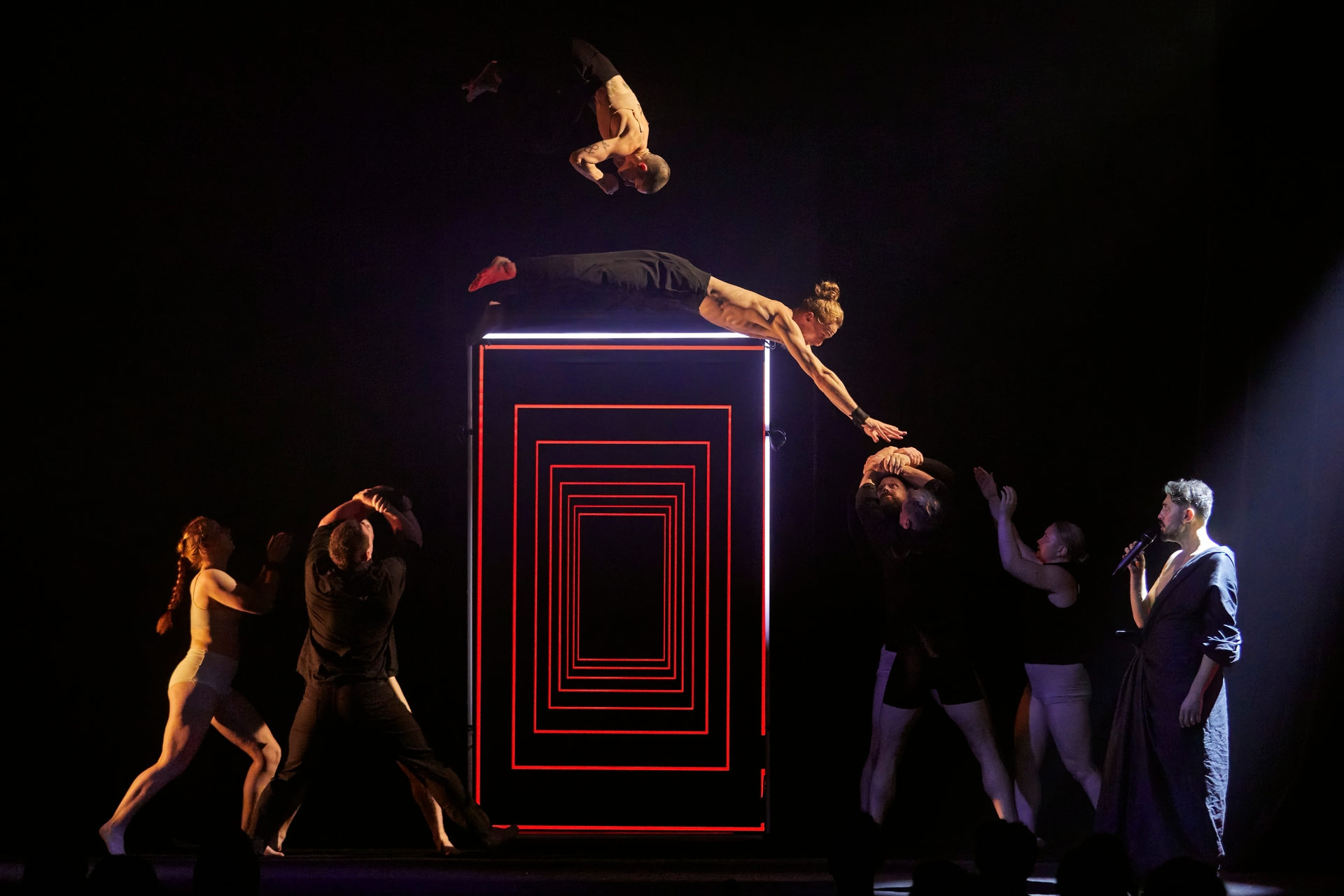 Tien topacrobaten onderzoeken met humor, energie en verbluffende precisie wat authenticiteit nog betekent in een wereld vol schermen, selfies en verwachtingen. Hun handelsmerk: de menselijke torens waarin de artiesten in- en uitspringen, opklimmen en afvallen.