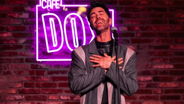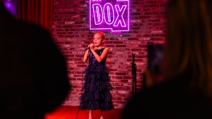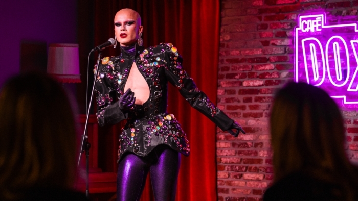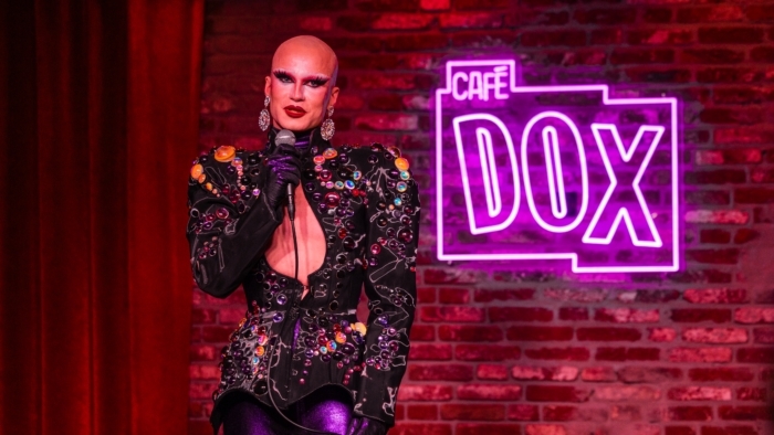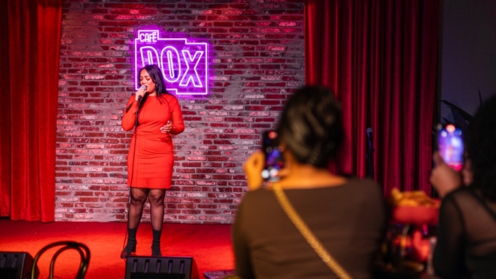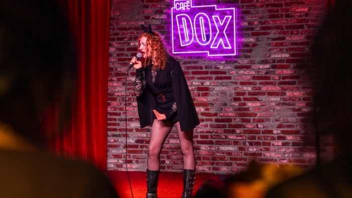Een persoon staat op een podium achter een microfoon en maakt een expressief handgebaar; de persoon draagt een lange jas en staat voor een muur met een felpaars verlicht cafébord met de tekst “CAFÉ DOX”.
